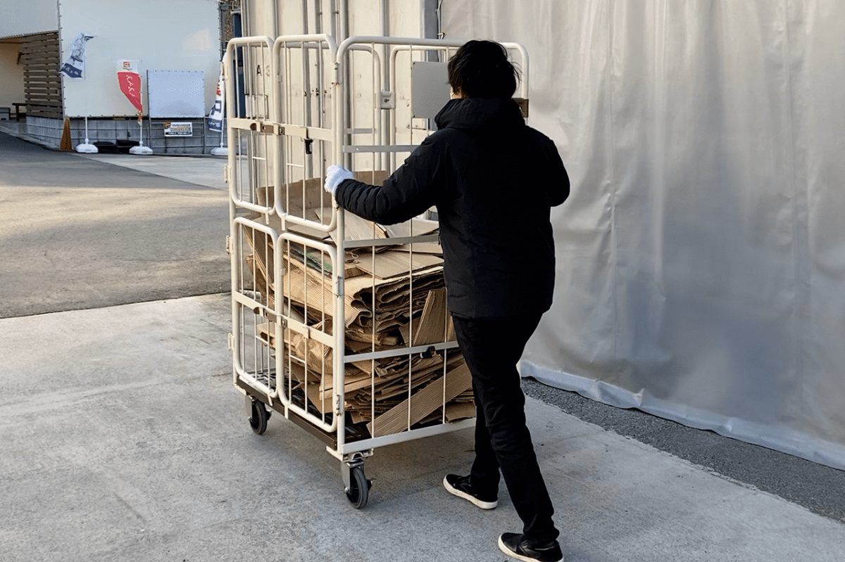 さらに、カゴ台車だからもちろんキャスター付き。今までは散らばった段ボールを集めて、手作業で回収場所まで持っていったり、あるいは保管した箱を持ち上げて何度も往復する必要がありました。