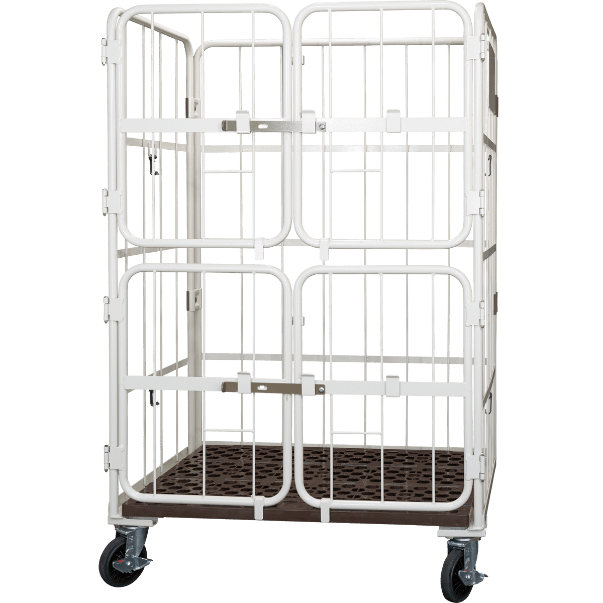 また『上下観音扉付きカゴ台車』であれば、正面の扉が荷崩れを防ぐため、さらに安全に荷物の管理ができます。