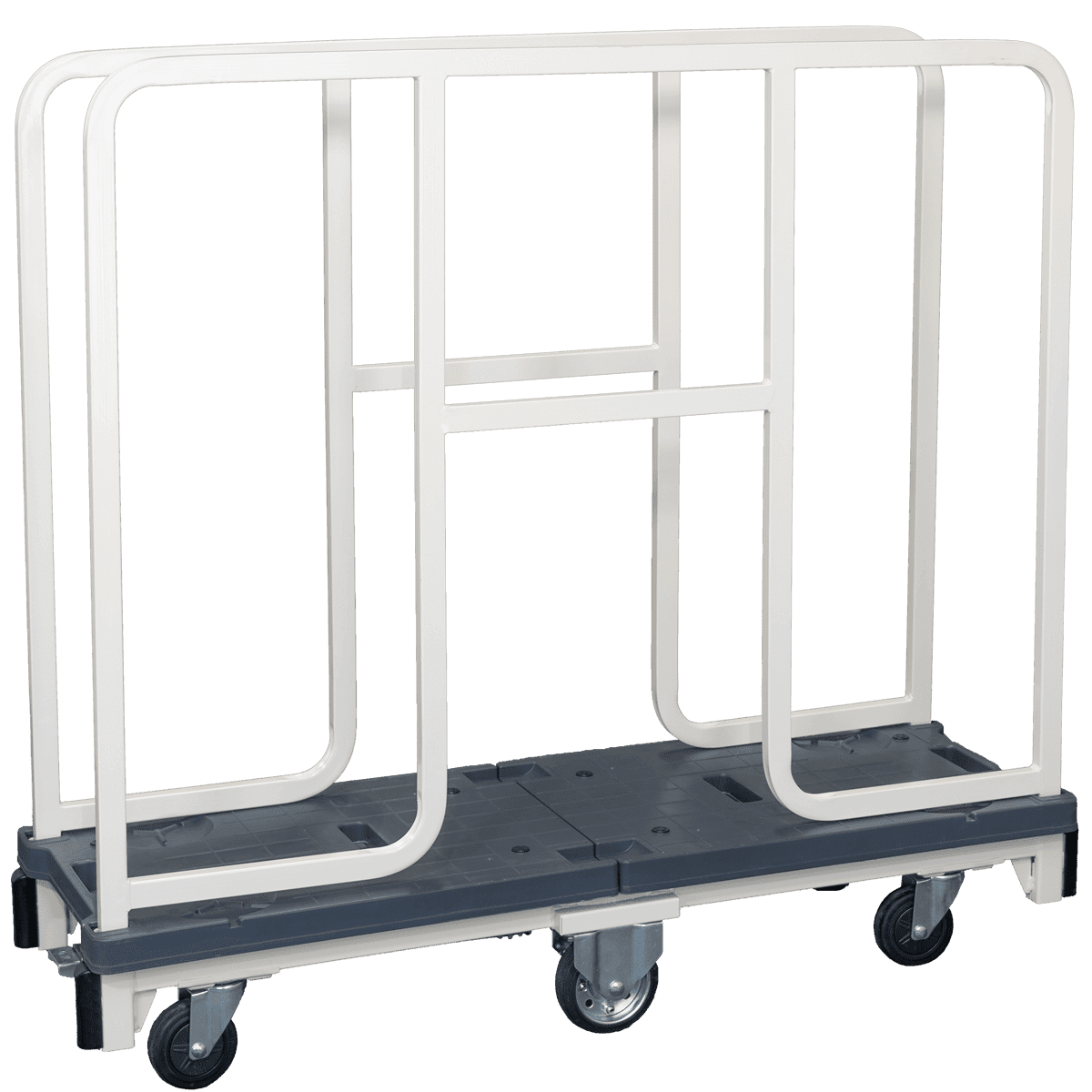台車そのものが縦長の形状になっており、挟むことで荷崩れ防止、転倒防止を実現できるほか、省スペース保管が可能になるため、道幅の狭い通路でも通行の邪魔になりません。