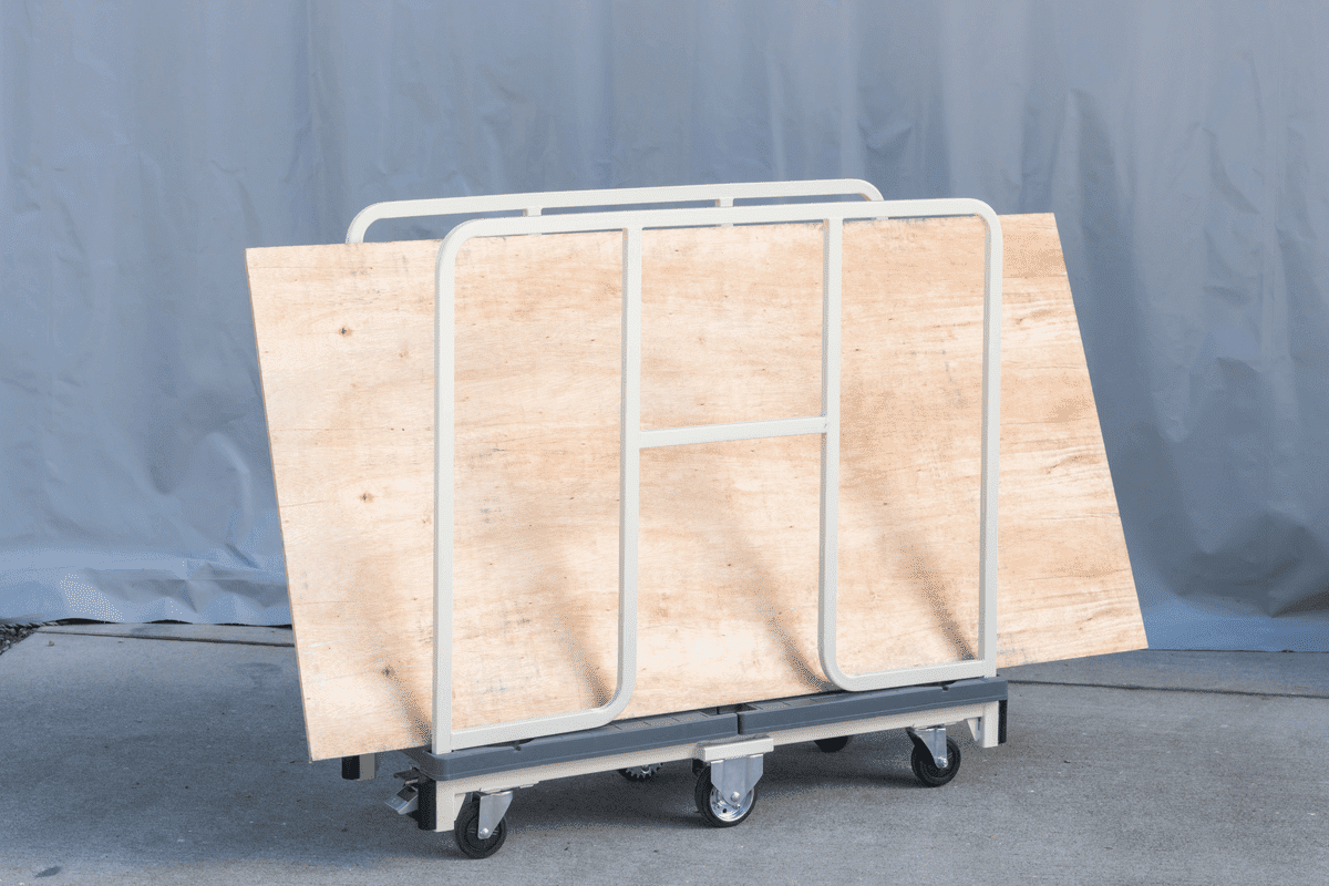 さらにベニヤ板やパネル、薄型の木材など、つい壁に立てかけたまま保管しがちな物には『長物用6輪台車』が最適です。