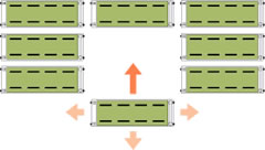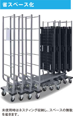 側面のスライドペダルを踏み込むと、センターの固定車が自在車に変換し側面への横移動ができるため、車輌の間など、任意の位置に移動することができます。 - 保管時は棚板を跳ね上げてネスティングが可能です。