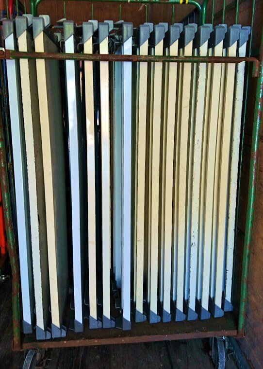 1台の6輪台車に最大5枚(段)まで取付け可能。使用しない時は、フレームに掛けて保管が可能です。