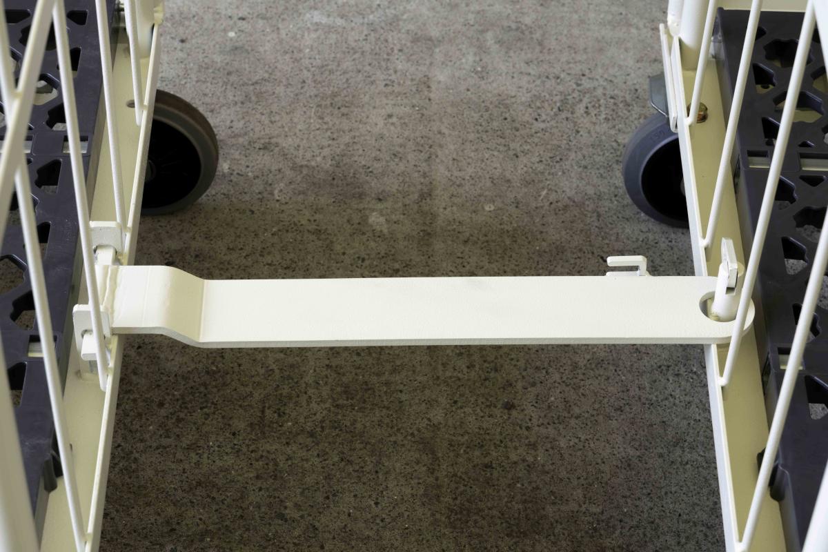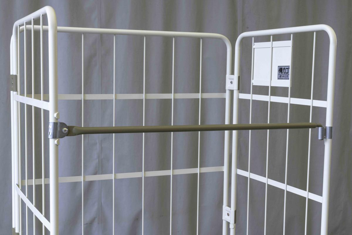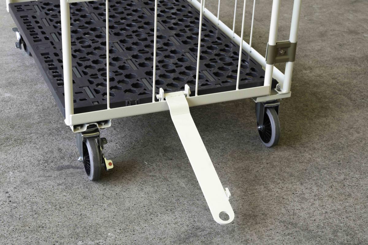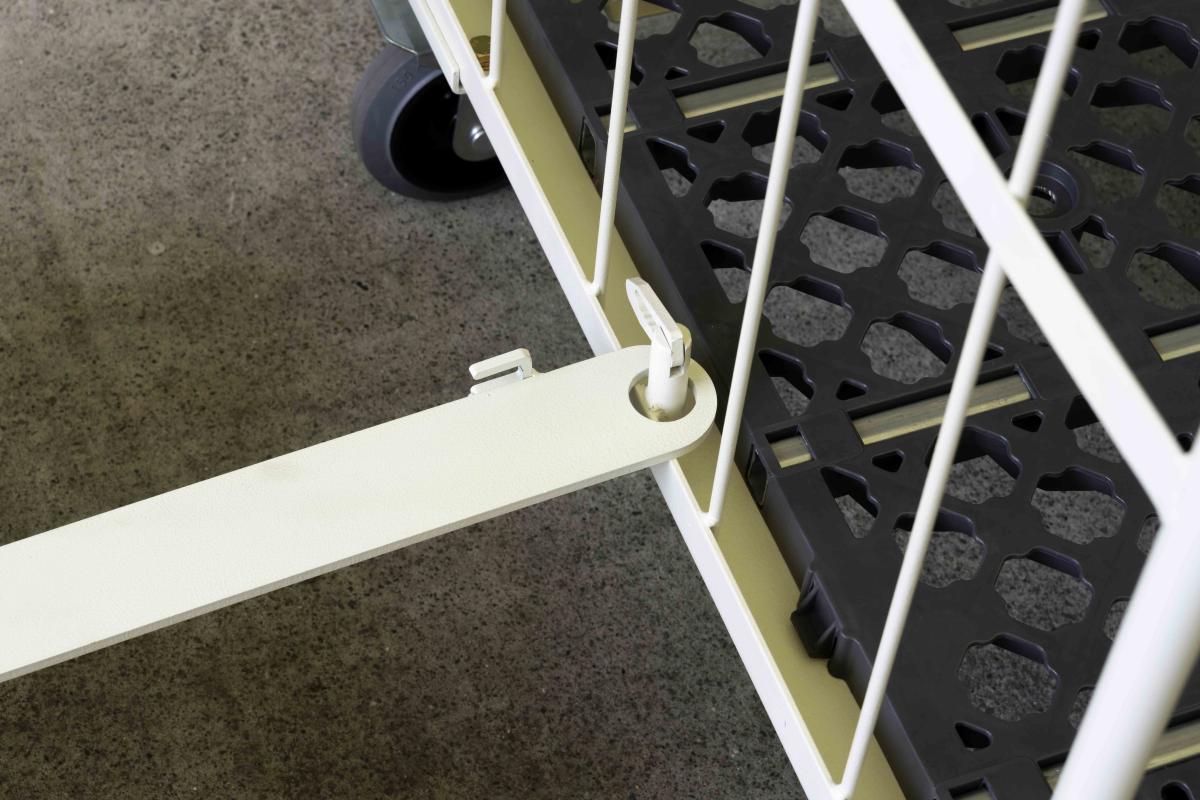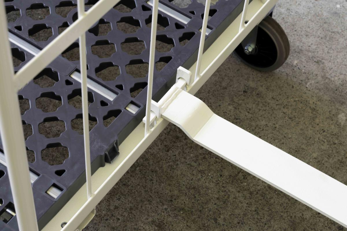 「俺のカゴ台車 連結モデル(連結カゴ台車)」に装着している連結装置は、折り畳み式で簡単に上げ下げが可能です。連結装置を下ろして、もう1台の連結部分にはめるだけ!!手間をかけずに連結できます。