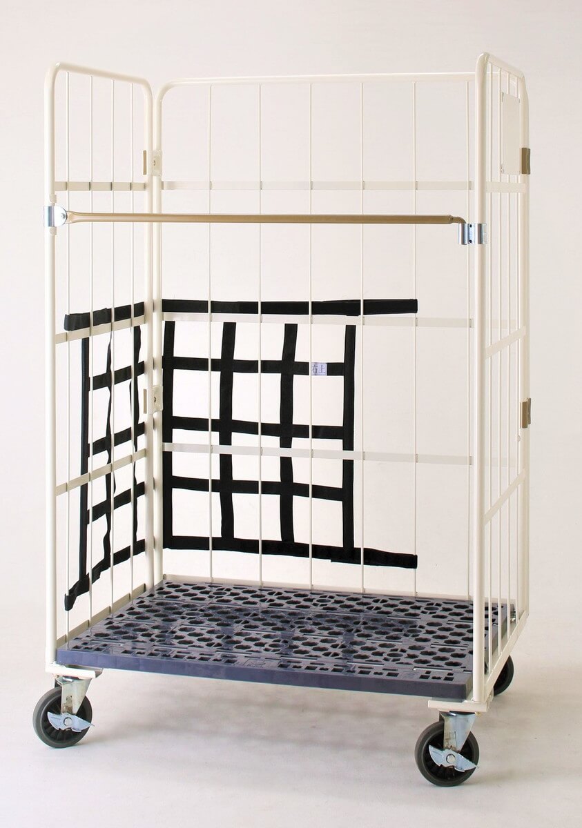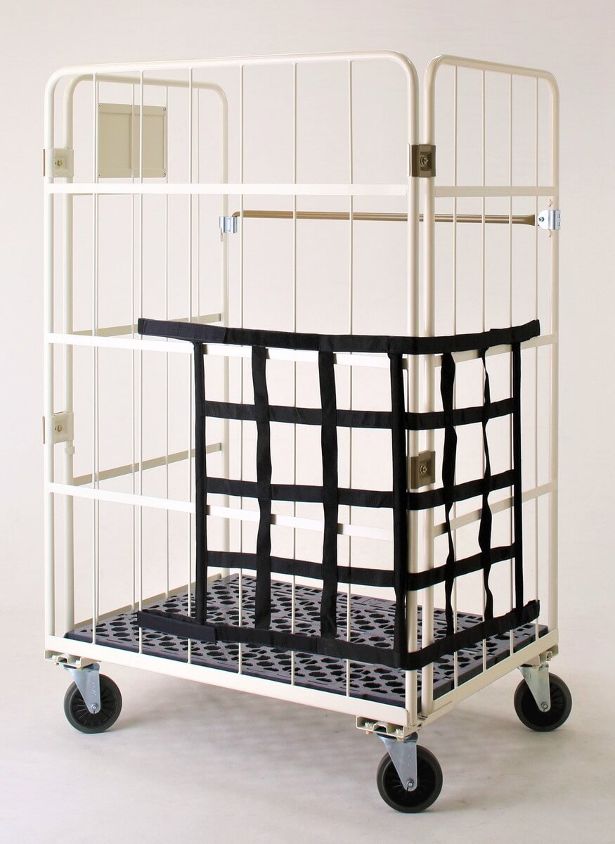 すべてのサイズのカゴ台車を観音扉仕様に変えることができます。また、荷物が台車から飛び出ていても、カバーが形を変えて荷物をガードします。