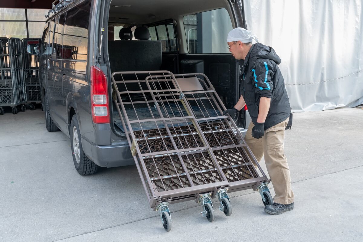 通常のカゴ台車では困難だった、ハイエースやキャラバンなどのバンタイプの車にカゴ台車を複数台乗せる、という事が可能になります!