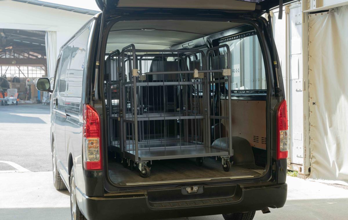 また、その低さを生かし、折りたたまずにハイエースやバンなどの商用車に積み込みが可能となり、さらに貨物用のエレベーターへの積み込みも可能となります。まさに天使。