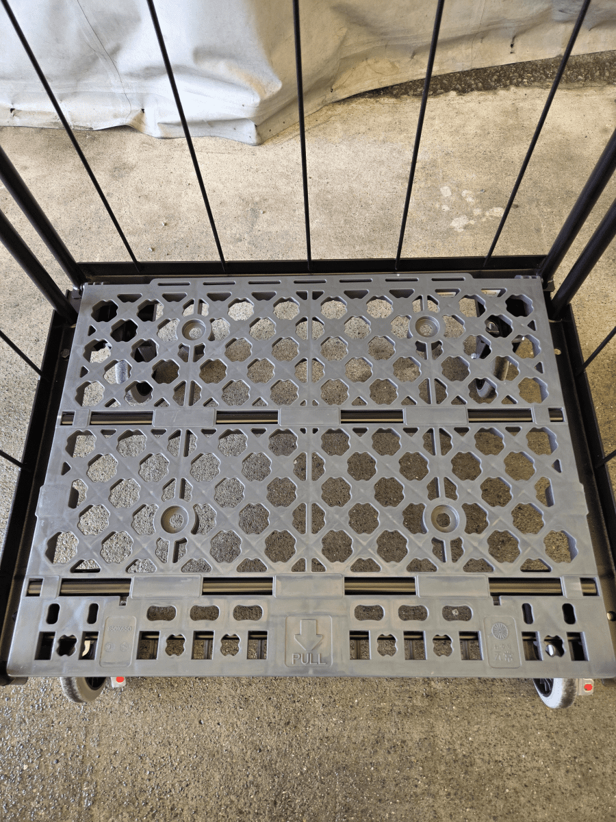 需要が多い人気のサイズで、割れにくい床板樹脂・ゴム跡が目立ちにくいグレーキャスターを使用。とても使いやすいカゴ台車です。