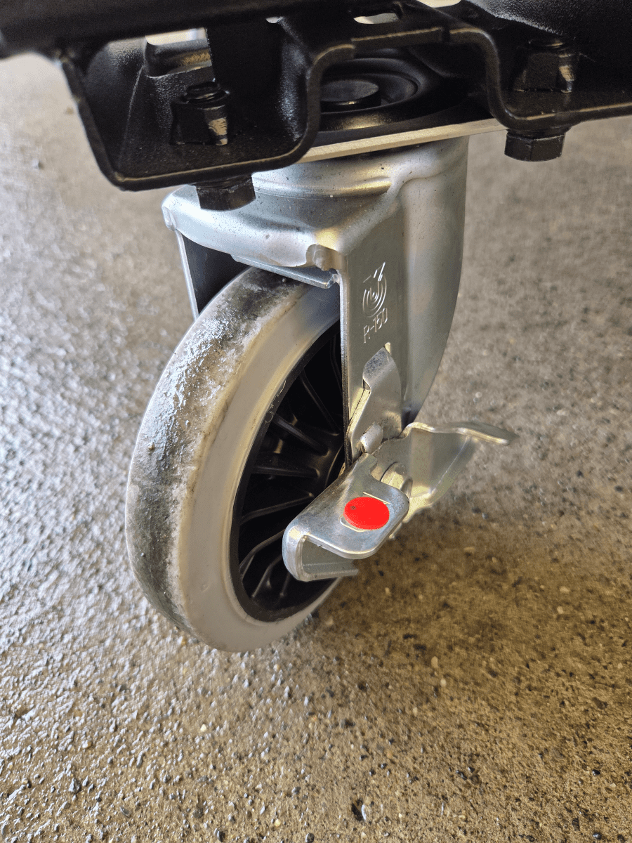「【新品】カゴ台車用キャスター 自在モデル ストッパー付き φ150グレーゴム」です。グレーゴムはゴム跡で床を汚す心配がありません。