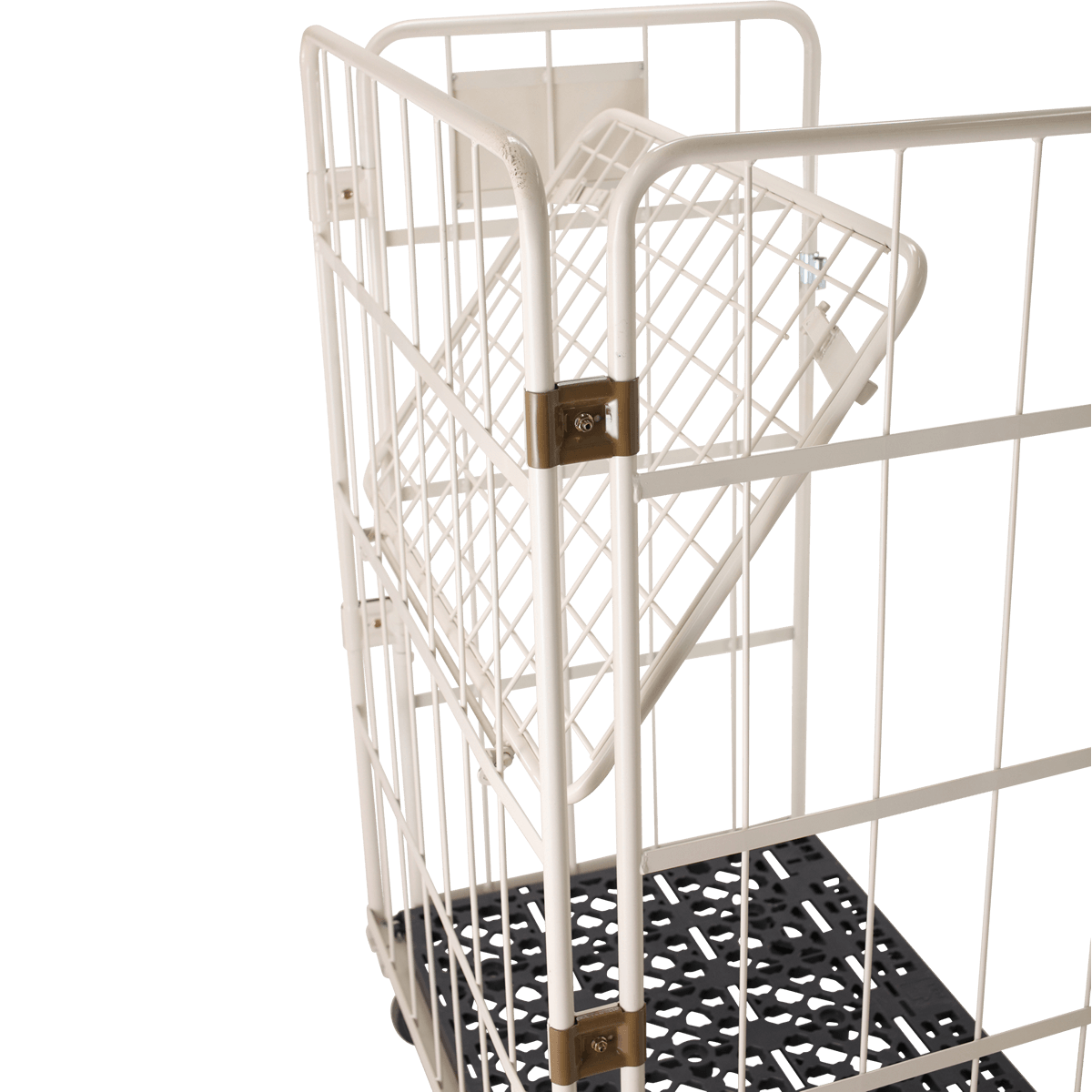 そんなお客様の不満や悩みを解消し、作業効率を上げる商品がこの「俺のカゴ台車 跳ね上げ式中間棚付き」となります。