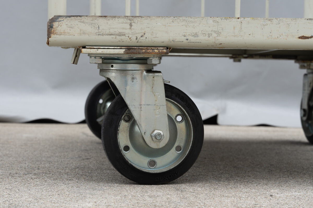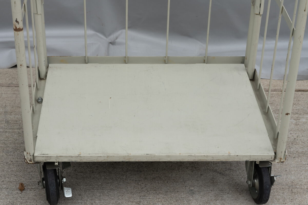 小さいサイズの床板鉄製W800中古カゴ台車を入荷!
