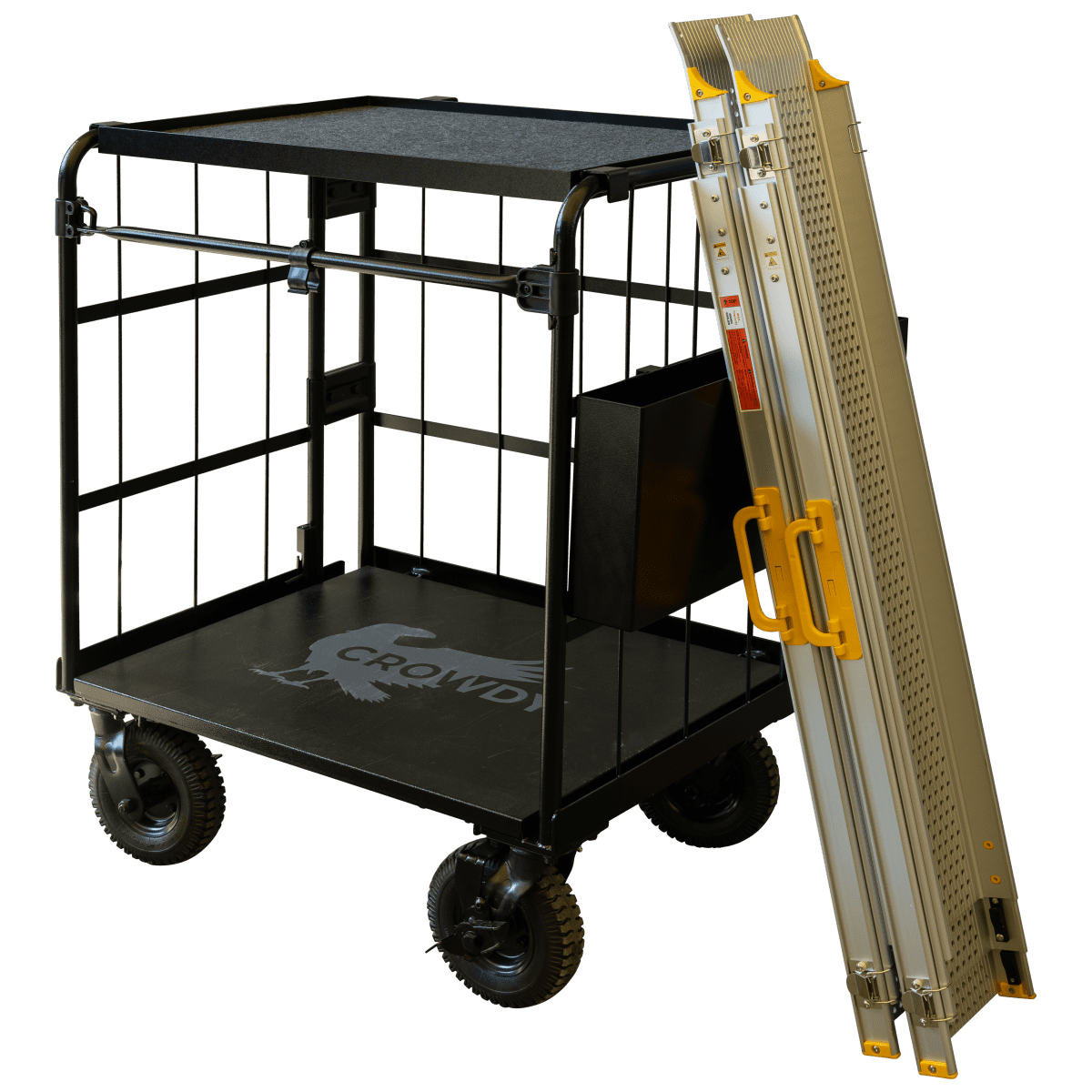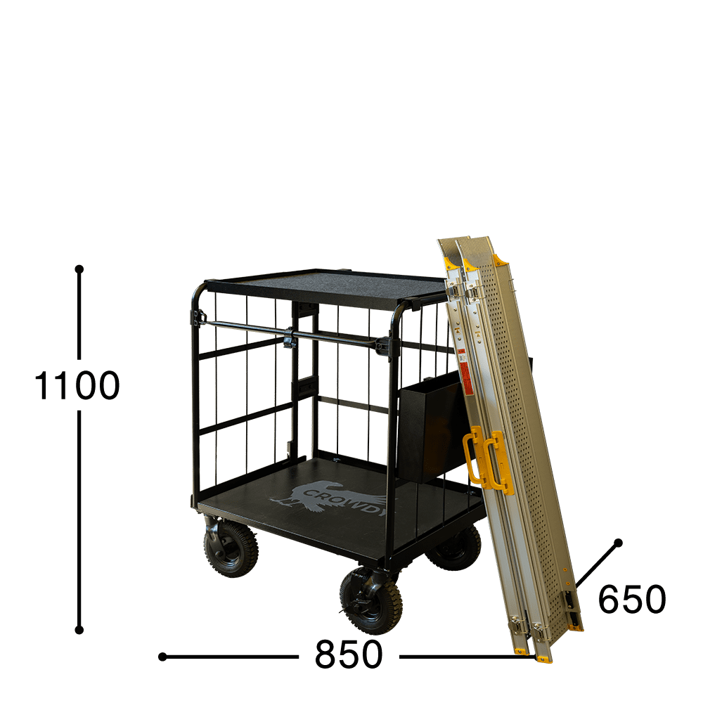 機材運搬台車「クロウディ」+中間棚「プレミアムシェルフ」+「アクセサリーボックス」+「クロウディ専用伸縮式スロープ」がセットになった、便利な4点セットです。