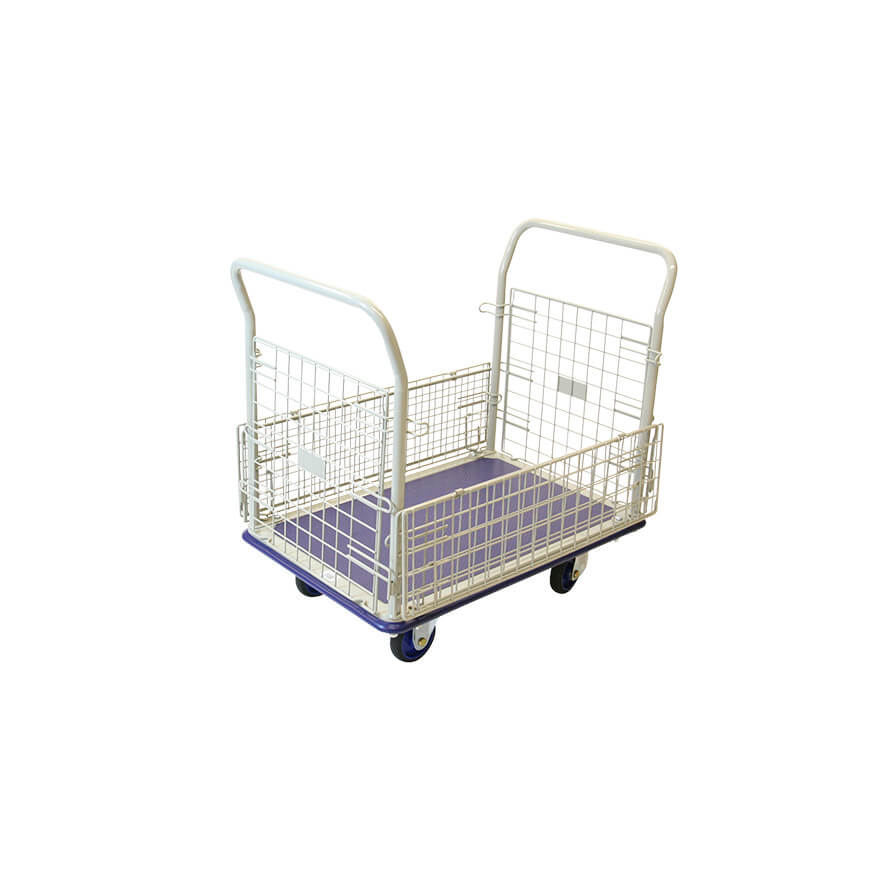 - 荷台の材質にハイテン鋼(通常の鉄板と比べ15%軽量かつ高強度の鉄板(積載面のみ))を採用したスチール台車です。