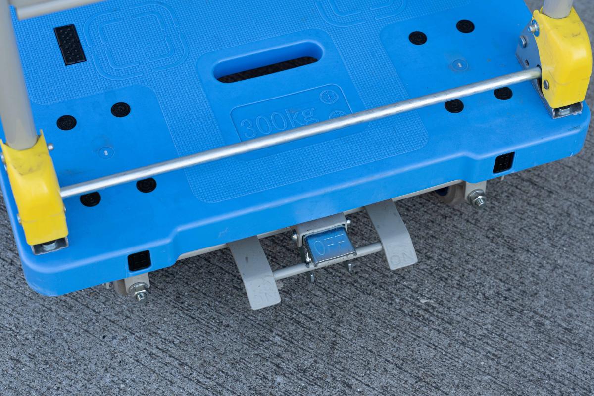ハンドルは折りたたみタイプです。傾斜地等での利用に便利なフットブレーキ付きです。