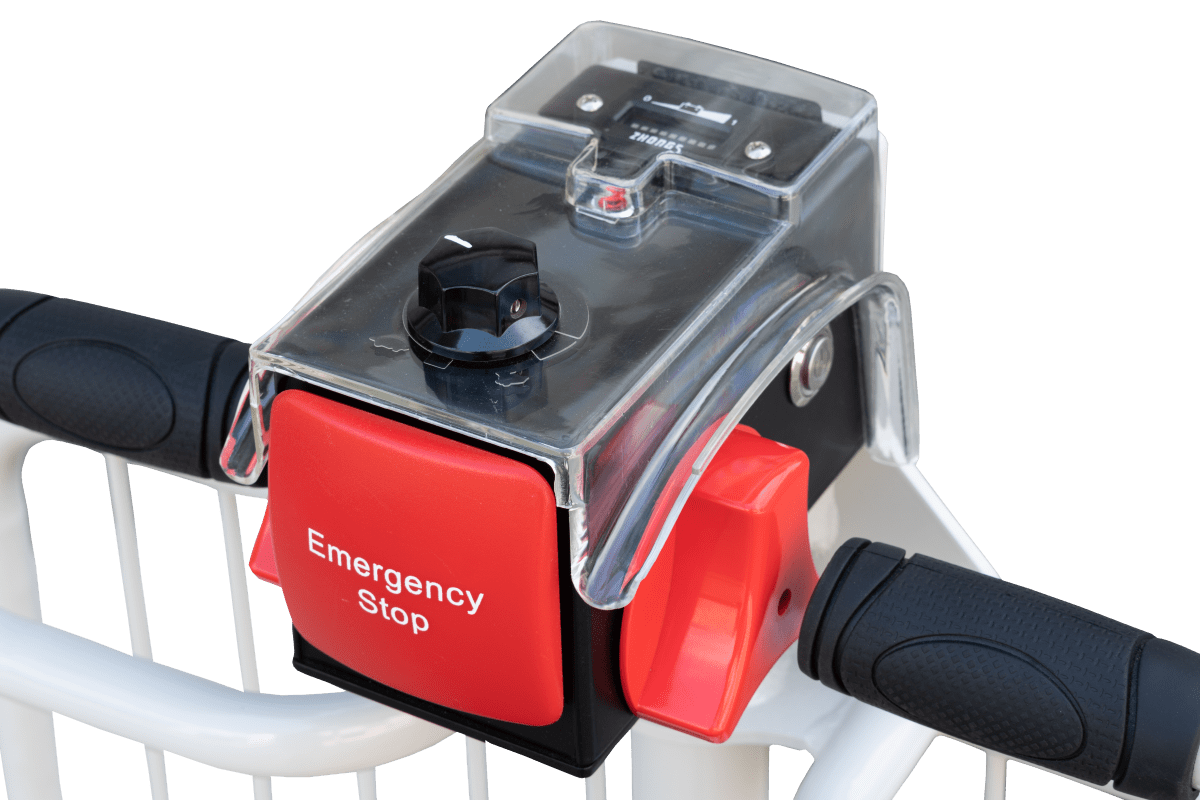 ハンドル部分に緊急停止ボタン、スロットルにはブレーキ機能を搭載しています。