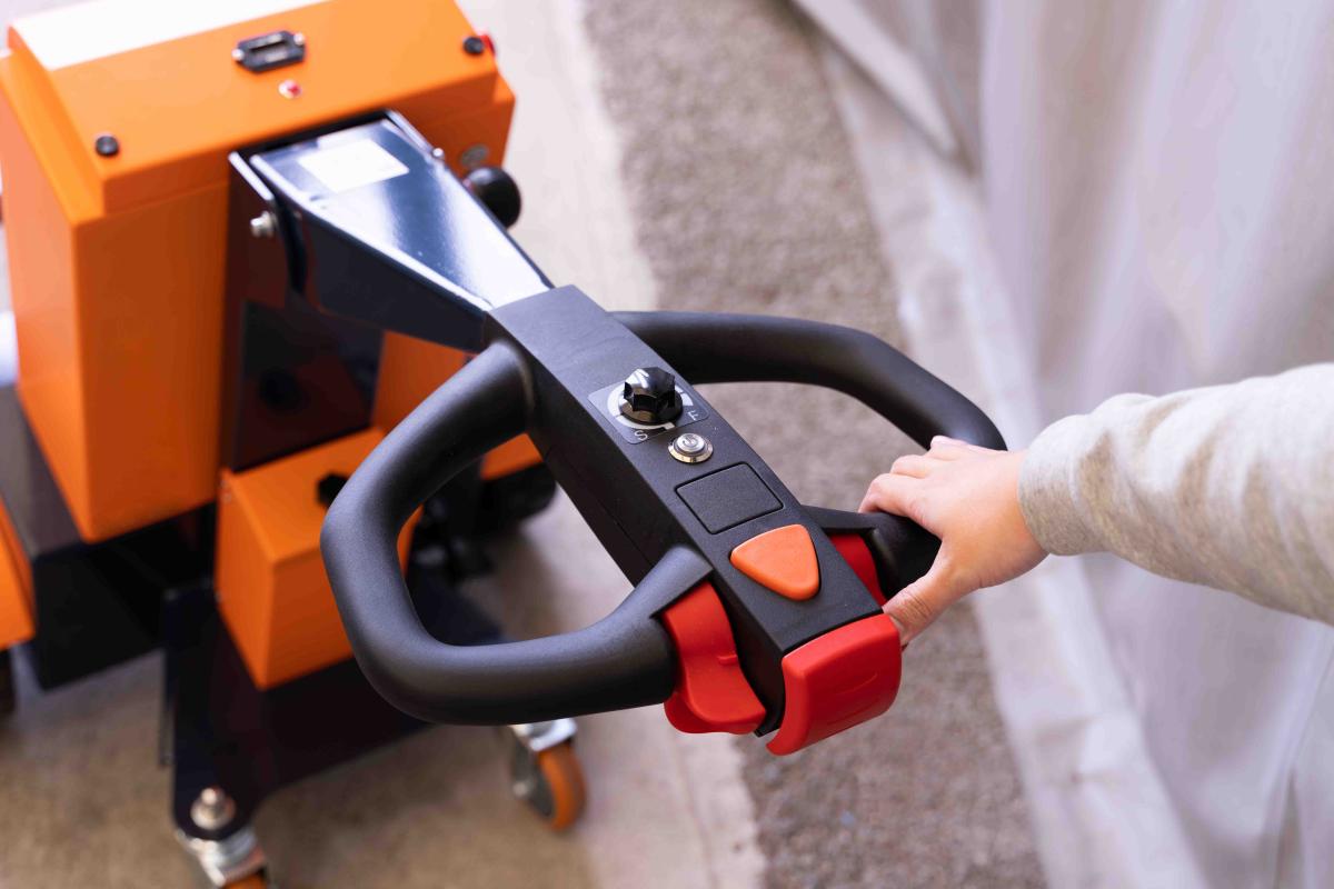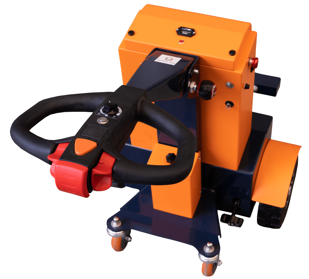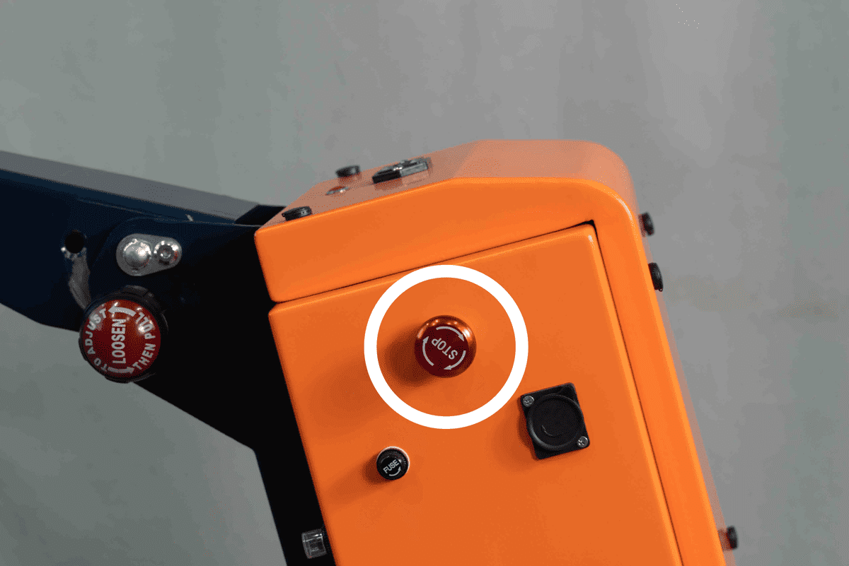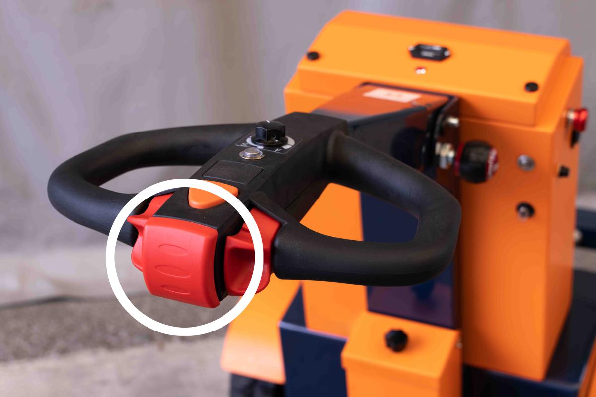 電動アシスト牽引車「パワフルバディ」のハンドル部分と本体横に緊急停止ボタンがあります。
