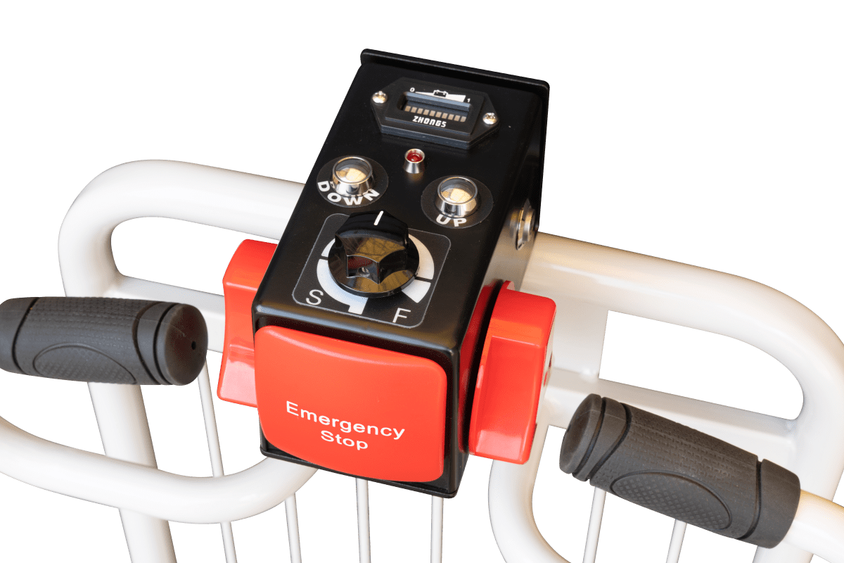 昇降式電動台車「エネリフター」はハンドル部分に緊急停止ボタン、スロットルにはブレーキ機能を搭載しています。