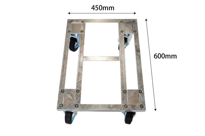 450mm×600mmの小型のサイズの低床アングル製台車です。ゴム車輪を採用しております。