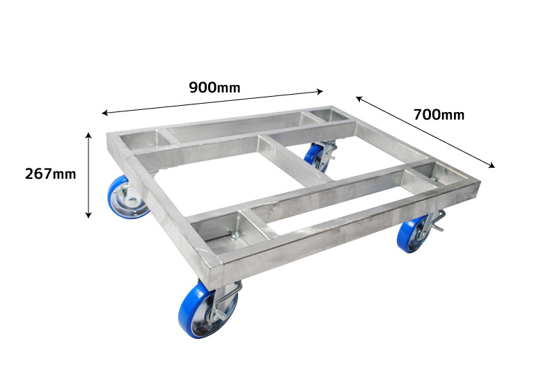 700mm×900mmの中型サイズの角パイプ(角型鋼)製台車です。耐久性に優れたウレタン車輪を採用しております。