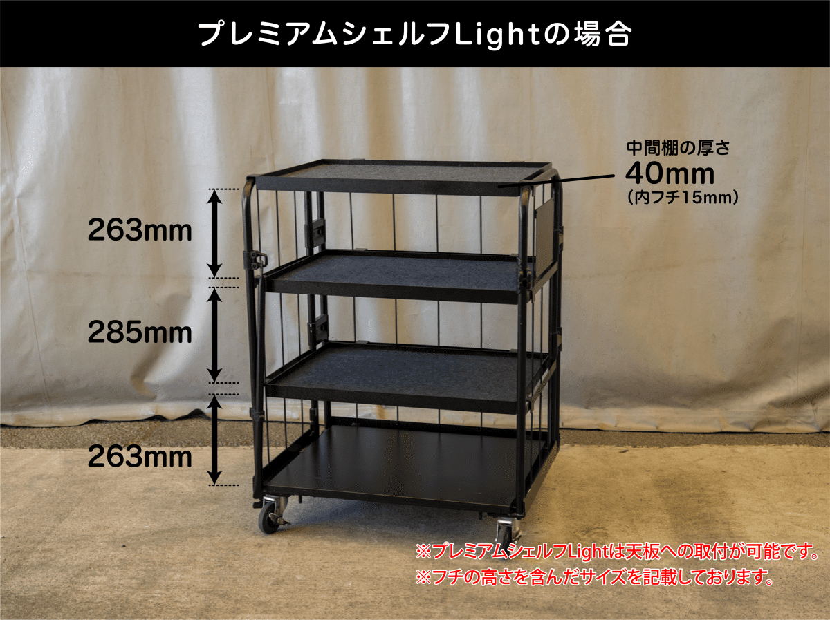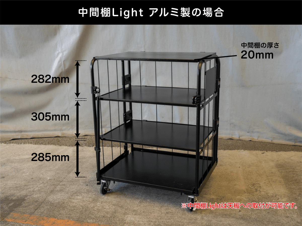 プレミアムシェルフLight・中間棚Light・スチール製中間棚を活用することで、荷物のサイズを問わず運搬や保管が可能になり、作業効率が大幅に向上します。