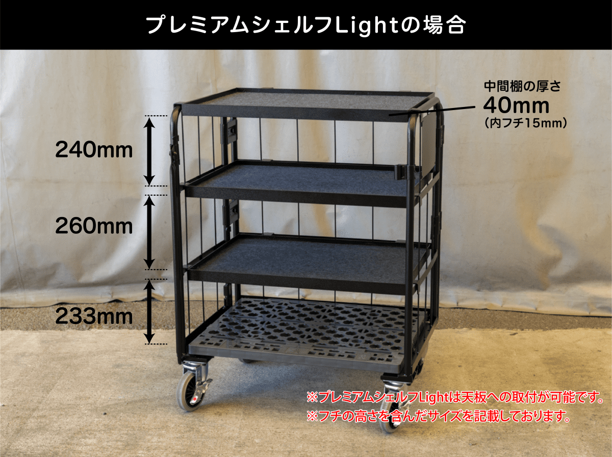 プレミアムシェルフLight・中間棚Light・スチール製中間棚を活用することで、荷物のサイズを問わず運搬や保管が可能になり、作業効率が大幅に向上します。