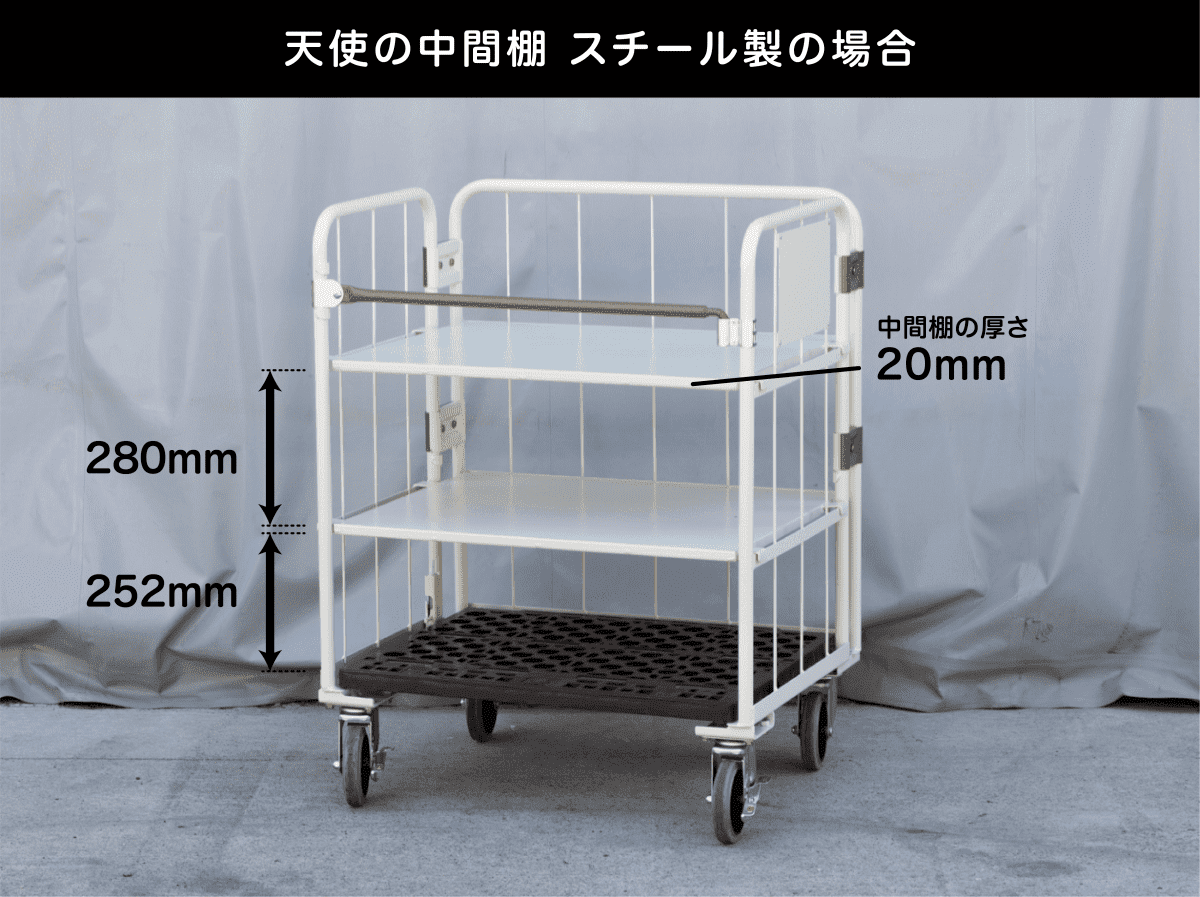 五常オリジナルの「俺のカゴ台車W1100」W1100xD800xH1700mmの自重45kgに対し、天使のカゴ台車は自重32kg!