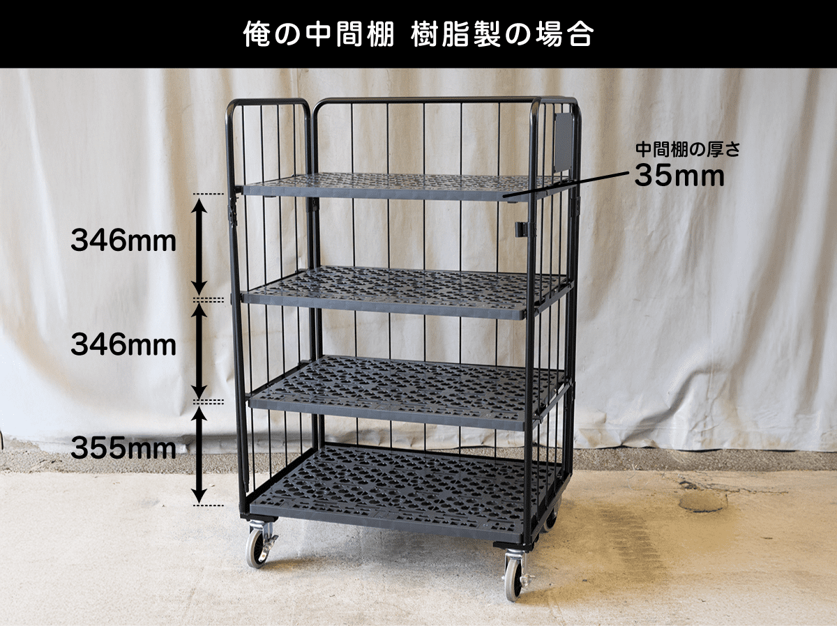 「【新品】俺の中間棚 ブラック W1100×D800用 樹脂製」です。スチール製と比較し軽量なのでカゴ台車への取り付け、取り外しがより簡単に。