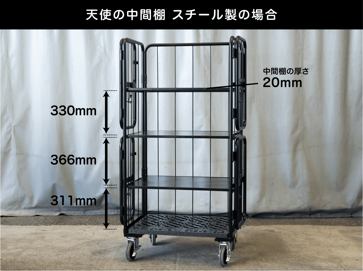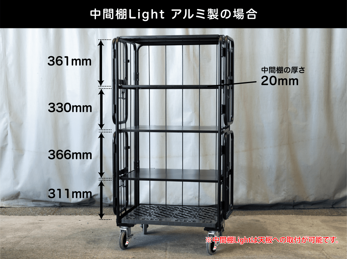 中間棚を活用することで、荷物のサイズを問わず運搬や保管が可能になり、作業効率が大幅に向上します。
