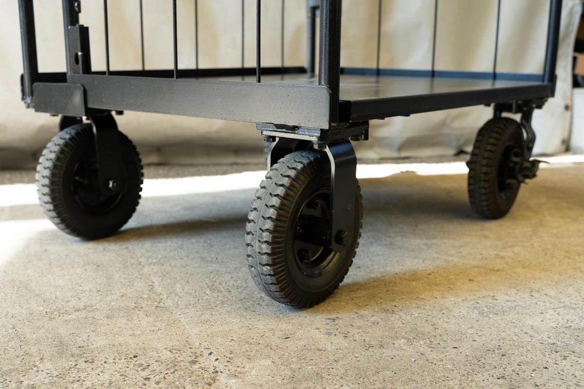 一般的なカゴ台車と比べ、50mm大きなキャスターで、不整地や屋外でも高い走破性を誇ります。