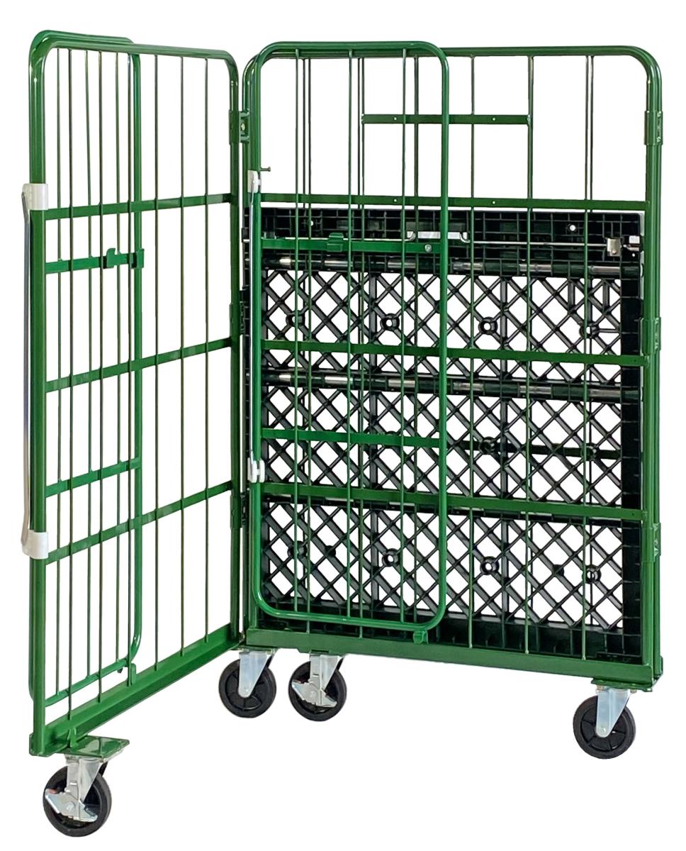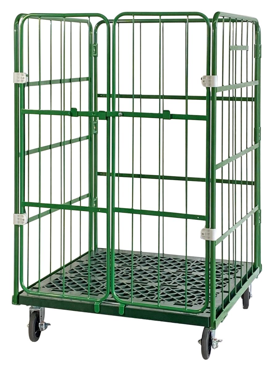 荷物の落下を防ぐ観音扉付きカゴ台車です。