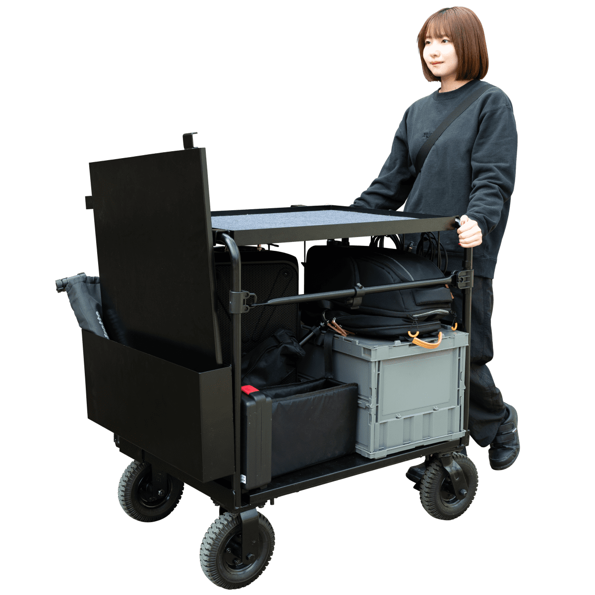 映像・音響業界に最適!機材運搬に便利な「クロウディ mini」は、黒一色で目立たないカゴ台車です。大径キャスターで悪路も走破し、両面折り畳み式で省スペース収納が可能。アルミ製のため軽く、持ち運びしやすいです。