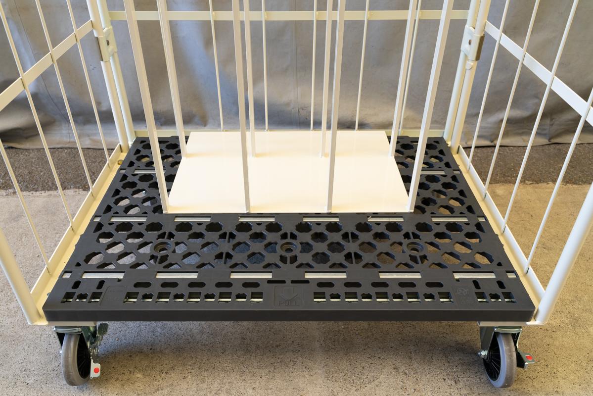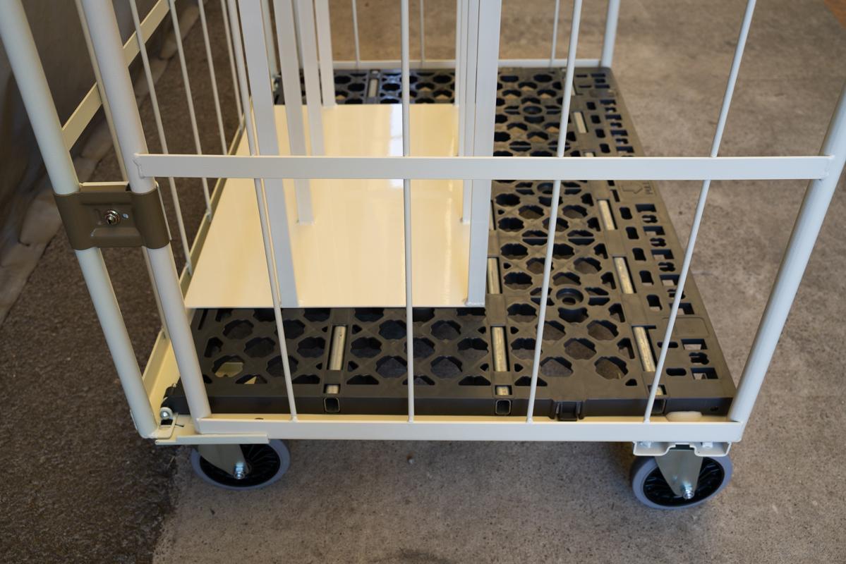 台車本体は既存のカゴ台車を活用することで、コストを抑えつつ、用途に合わせた仕様を実現。