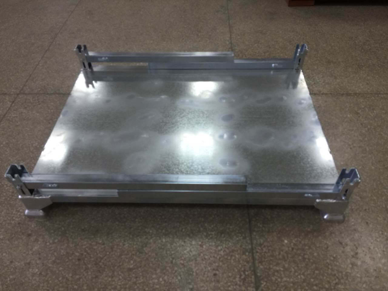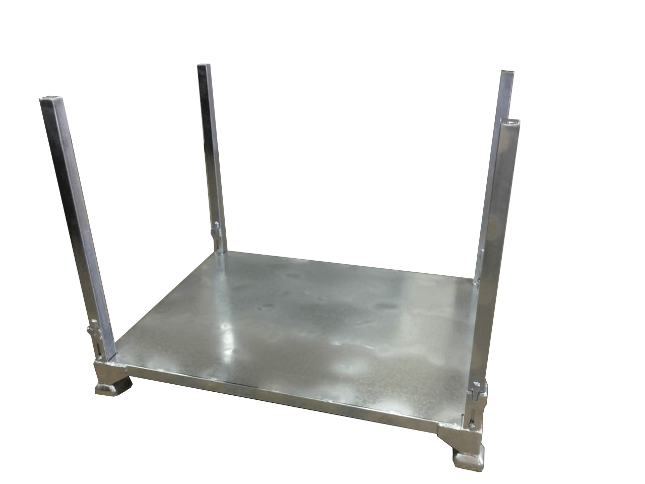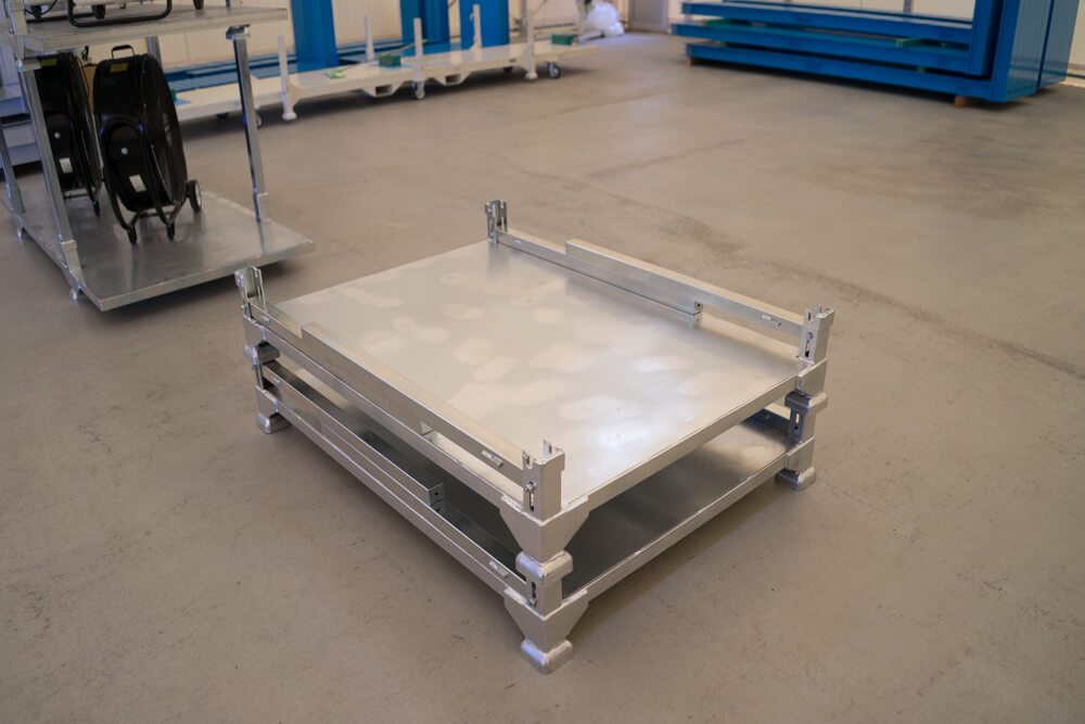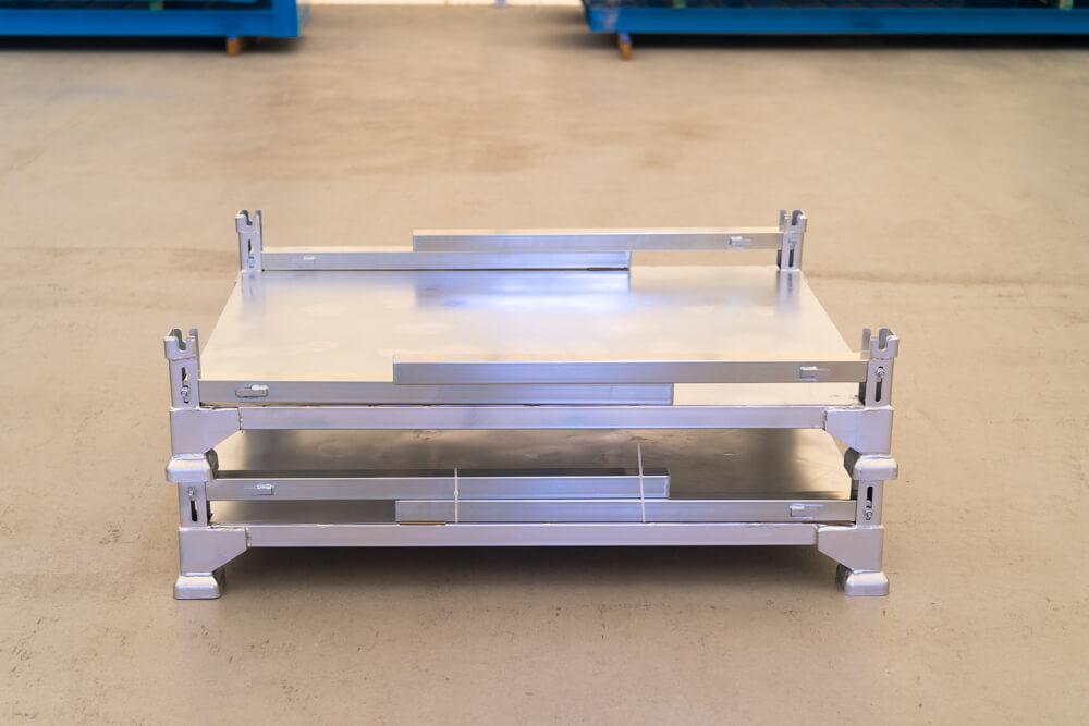 1000kg載せた状態で4段まで段積み可能であり、保管時には支柱を折り畳むことが出来る為、スペースを取りません。耐久性に優れており、保管時の空間効率も考慮して設計されております。