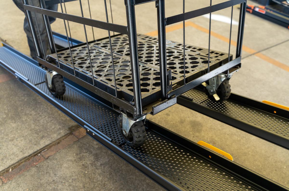 最大3m!圧倒的な緩やかさで、機材を積んだカゴ台車をスムーズに積み下ろし!