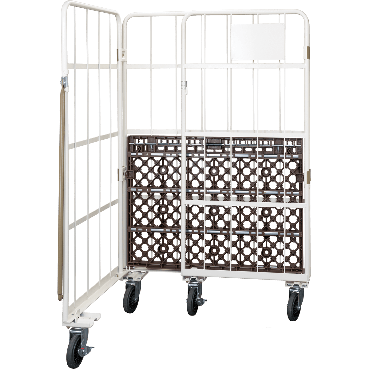 カゴ台車とは、開口部以外の3面が囲われている運搬用の台車の事をいいます。